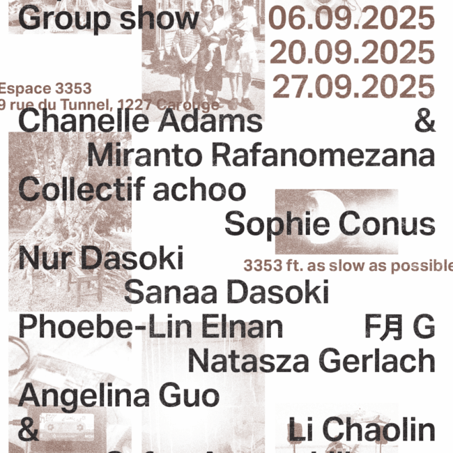 L’Espace 3353 est un espace culturel qui a ouvert ses portes en octobre 2018 à l’initiative du collectif HOY. Dans le cadre d’une résidence curatoriale de 18 mois, de novembre 2023 à mars 2025, le collectif as slow as possible (Román Alonso, Phoebe-Lin Elnan, Li Chao Lin et Yul Tomatala) en assure la gestion et la programmation. as slow as possible vise à four-nir une plateforme d’échange et de réflexion aux artistes engagés dans des pratiques et des recherches politiquement chargées, en rapport avec nos conditions contemporaines. Intitulé Faire-lieu, faire liens, la programmation proposée par le collectif se veut interdisciplinaire et portée sur la création de liens forts et durables entre ses artistes et son public. Ici, 3353 agit comme un espace de collaboration et d’échange rassemblant des contributeur·rice·x·s de différents domaines et lieux.